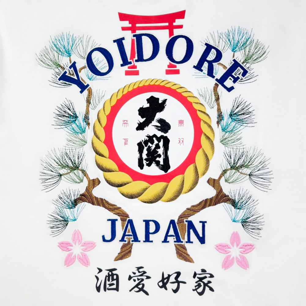 「酔」「YOIDORE]「JAPAN]の文字、桜や松は高級感ある刺繍で表現。